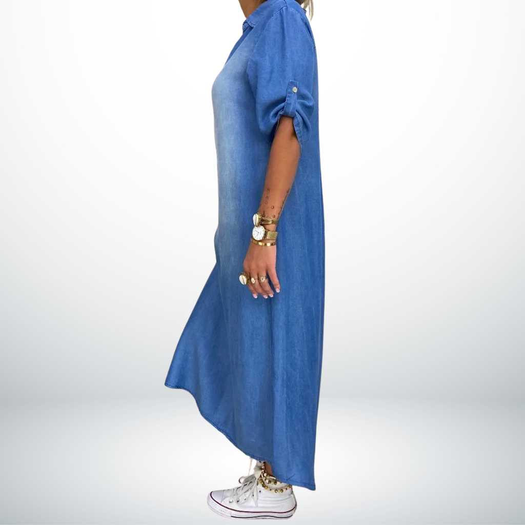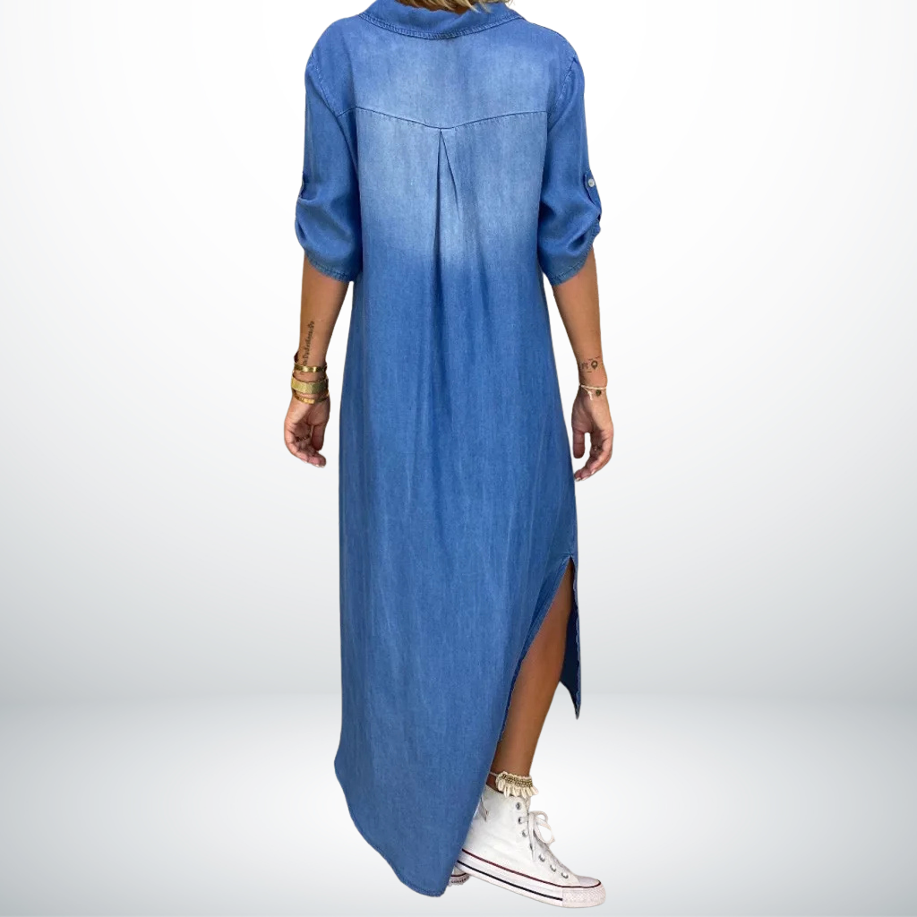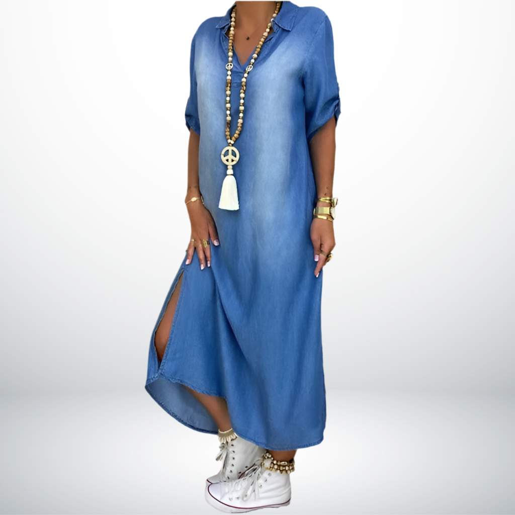 Con l'abito Lea™ puoi godere di un'eleganza senza sforzo e di un comfort senza tempo. Il design in denim leggero scivola dolcemente lungo il corpo, mentre la sottile apertura laterale aggiunge un tocco di femminilità e libertà di movimento. Perfetto per una giornata rilassata o una serata elegante, progettato appositamente per la donna moderna che apprezza sia lo stile che la comodità.