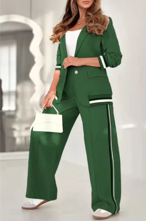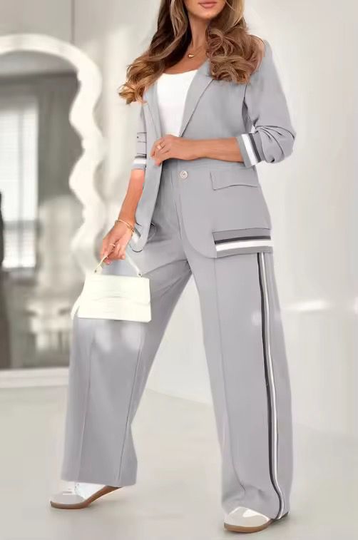 Il completo Solaria unisce perfettamente stile moderno e comodità quotidiana. Il blazer dal taglio definito e i pantaloni ampi regalano un look curato ma rilassato — ideale per affrontare la giornata con stile, dal mattino alla sera.