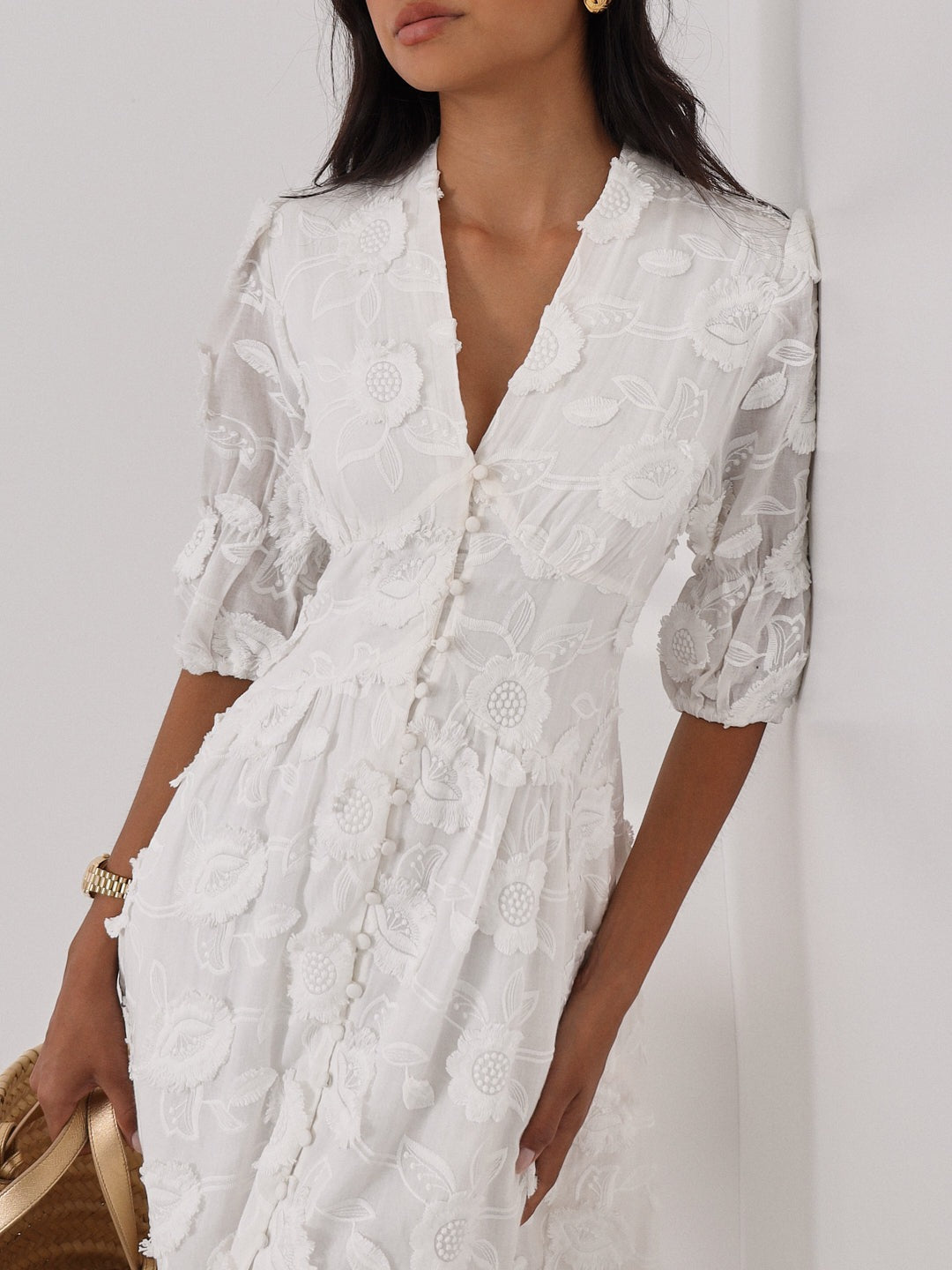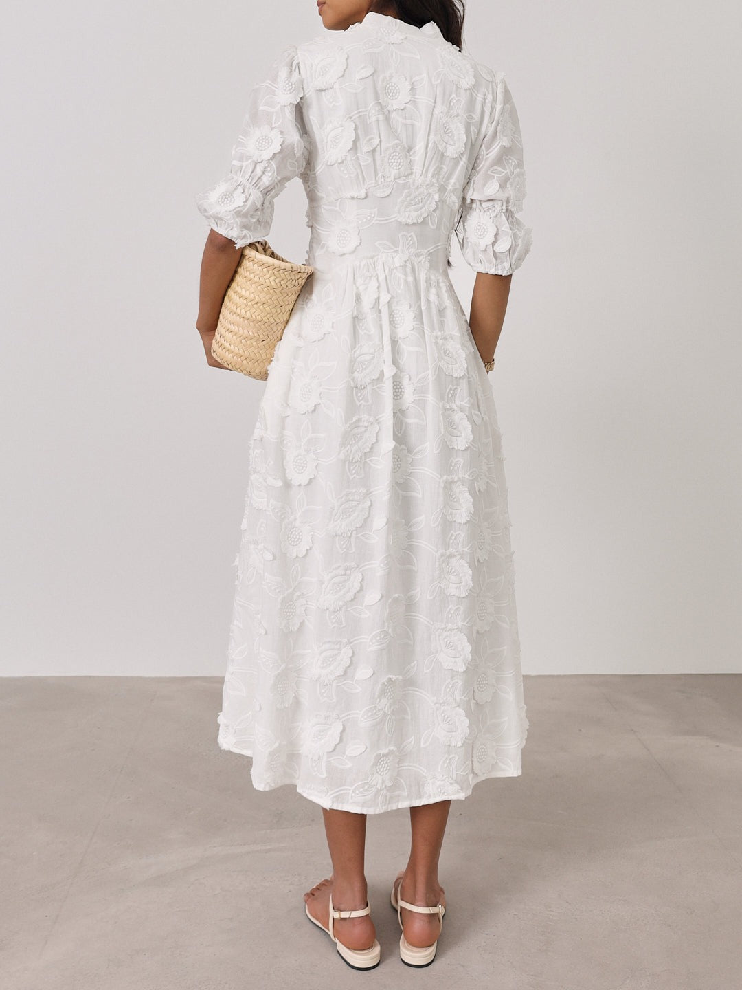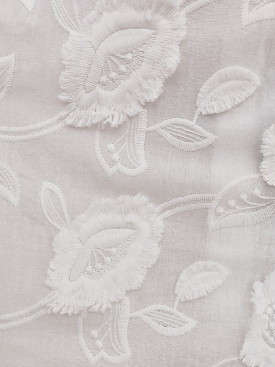 Il ricamo floreale crea una texture visiva raffinata e irresistibile, che attira sguardi e complimenti.